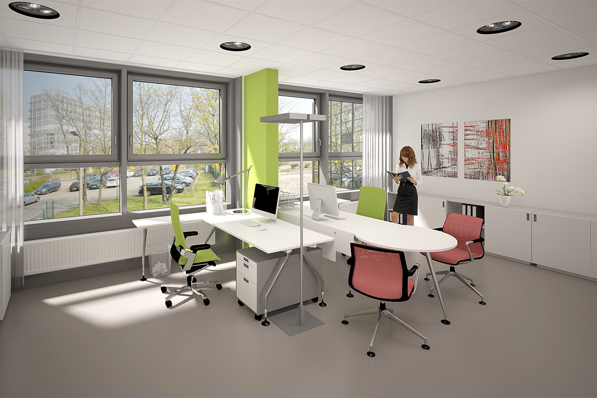 Tageslichtbüros angeordnet. Schallschutzglas, Sonnenschutz, natürliche Belüftung sowie eine moderne Medienausstattung sind Teil der optimalen Arbeitsumwelt im Objekt.