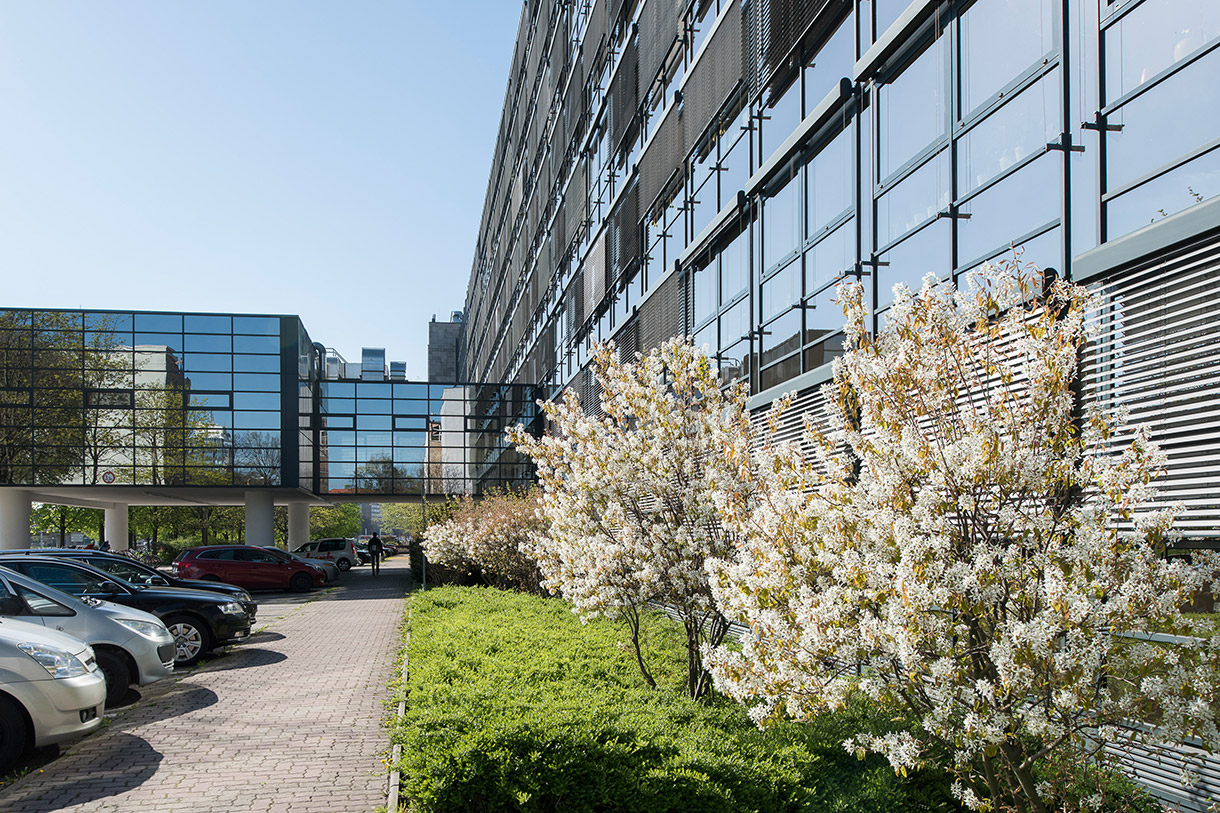 Ein weiteres architektonisches Highlight ist der dem Eingang vorgelagerte Kubus, in dem sich die hauseigene Cafeteria mit Mittagsangebot befindet. Ihre 240 m² Grundfläche sind zugleich Überdachung der Fahrzeugvorfahrt, welche bei Mietern und deren Besucher nicht nur bei Regen einen hochwertigen, repräsentativen Eindruck hinterlässt.